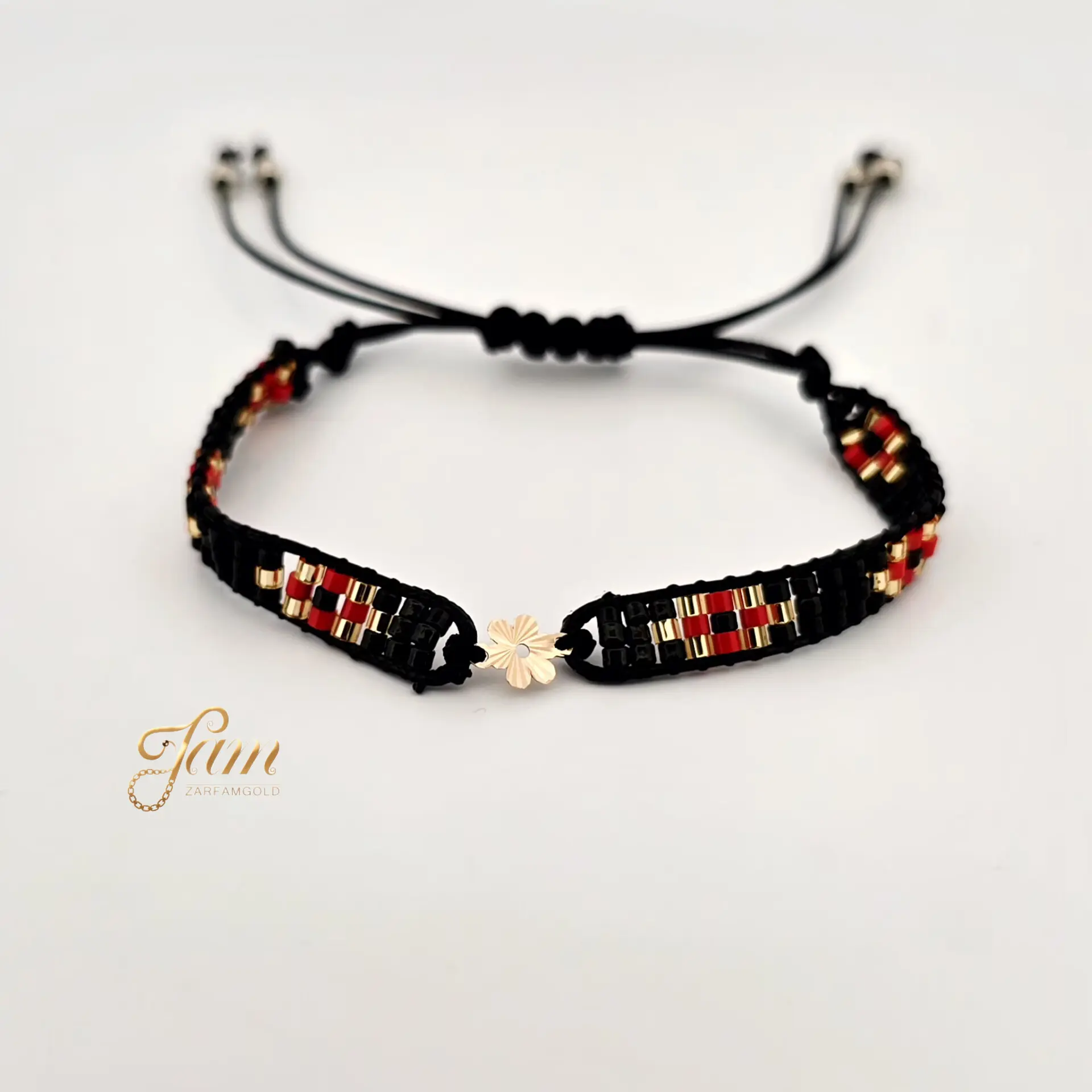 دستبند طلا گل تراش با بند میوکی مشکی و قرمز کد BL7431