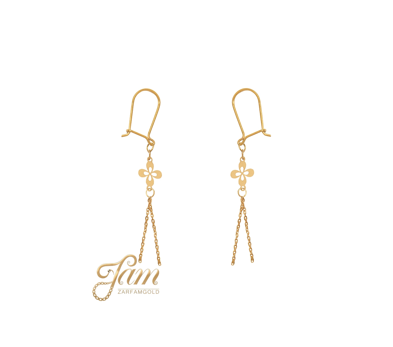 گوشواره طلا عصایی گل 4 پر با آویز زنجیر کد E7798