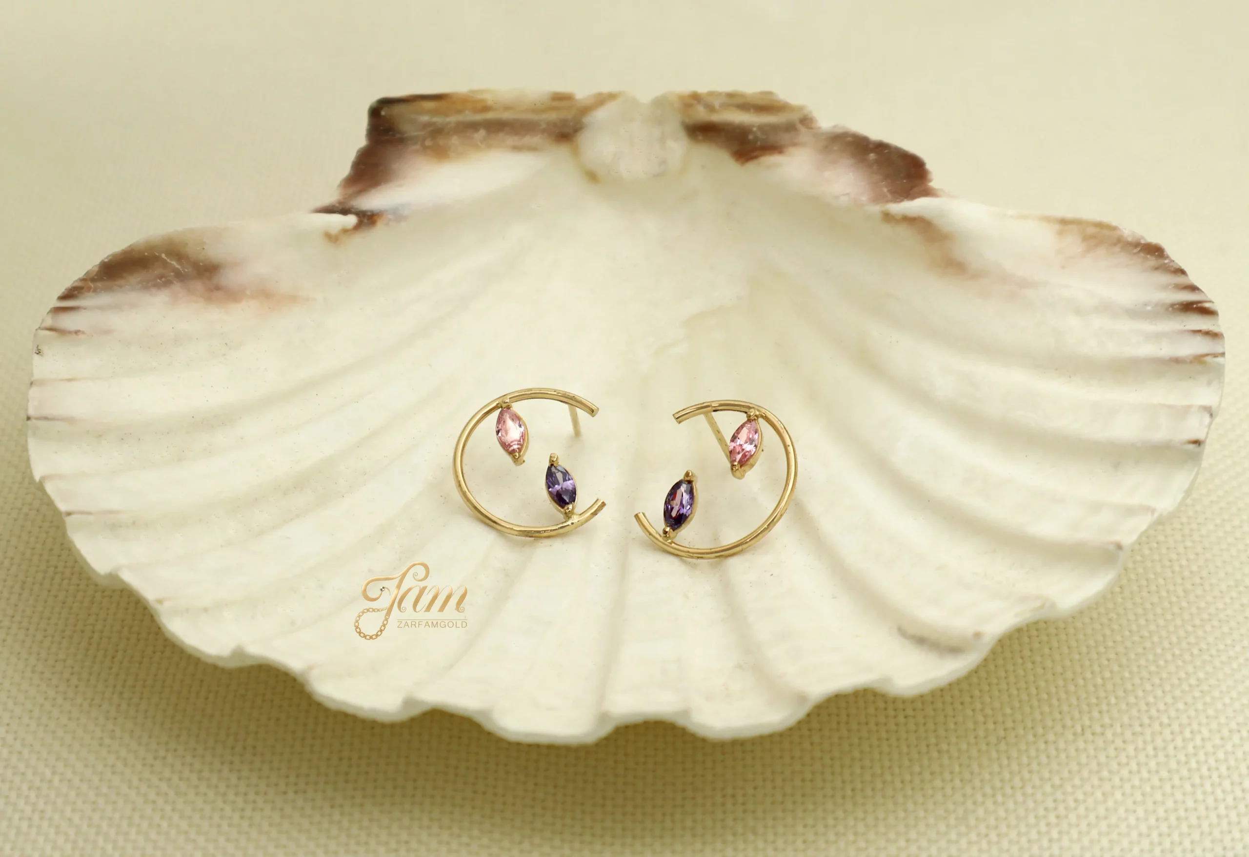گوشواره طلا لوکس نیم دایره با دو نگین صورتی و بنفش کد E5298